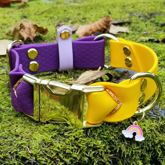 Collier en BioThane® jaune et sangle hexa violet foncé,