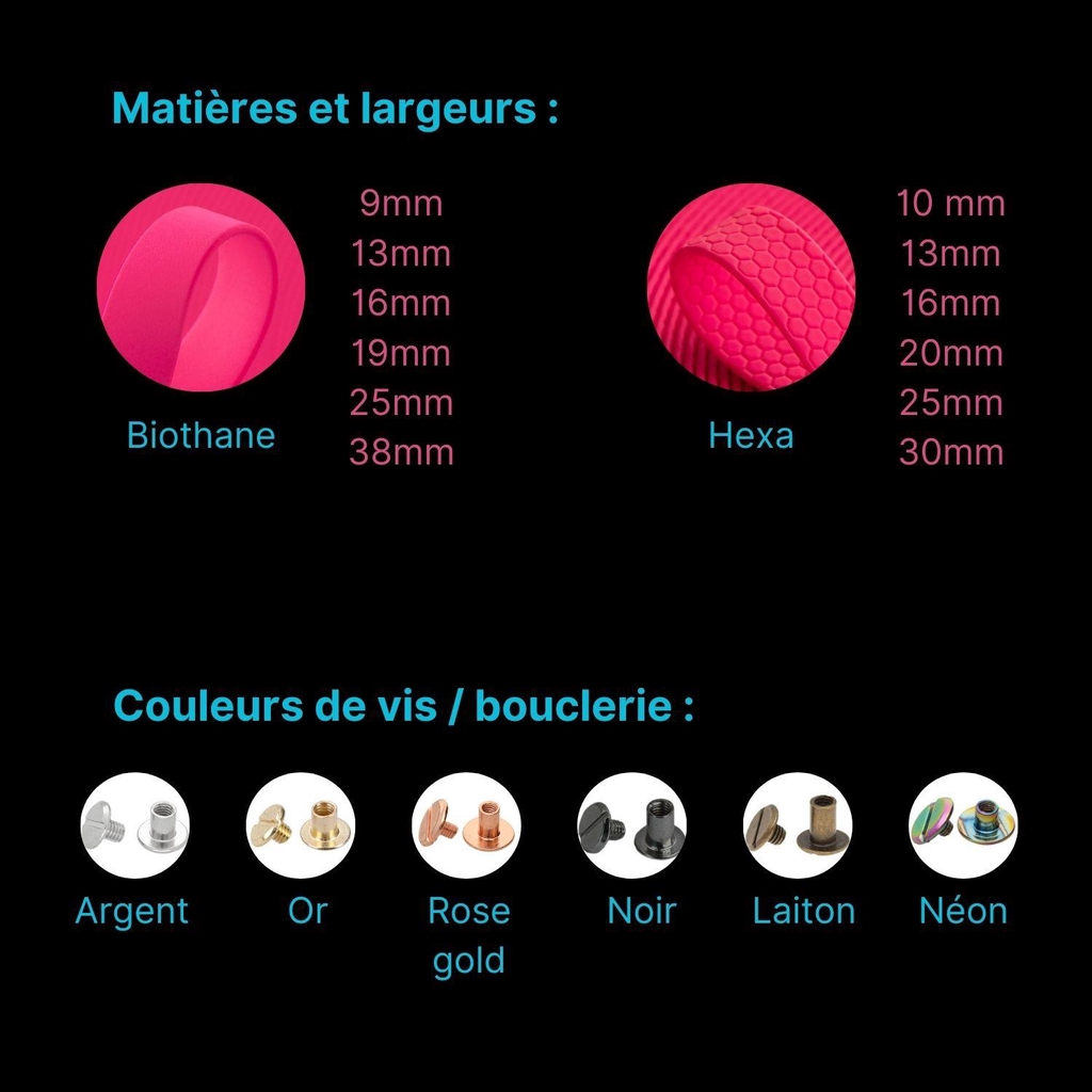 Il s'agit essentiellement de sangles en polyester avec un revêtement en PVC. Elles sont donc véganes, résistantes et faciles d'entretien.